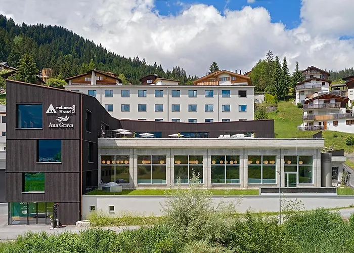 The family-friendly Laax Wellnesshostel3000 hostel lies around 6 km from the Il Spir Viewing Platform, offering 93 rooms and featuring spa therapy and a shared lounge.